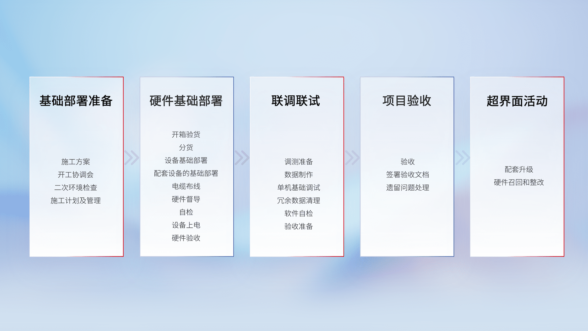 从基础部署准备、、硬件基础部署、、、联调联试、、、、项目验收、、、、越界面活动的全过程可追溯,,保证施工质量和进度。。。